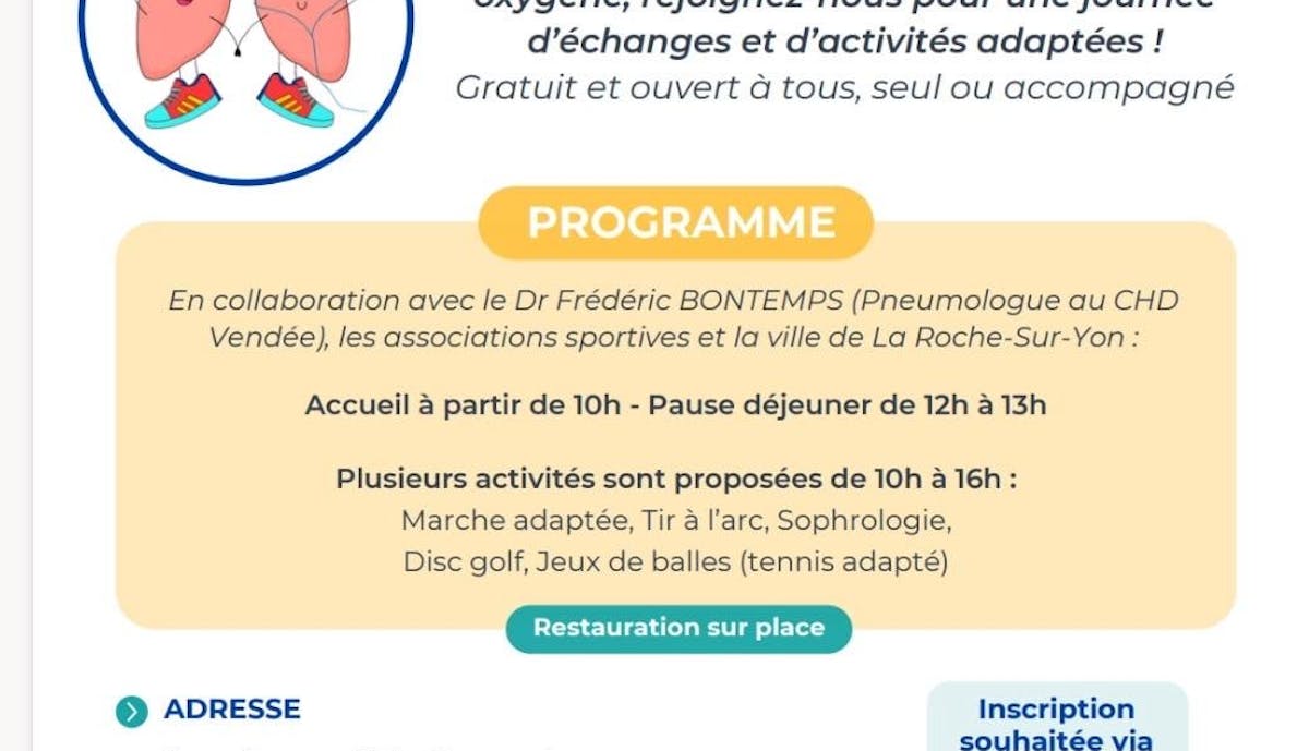 Organisée par la ville de La Roche sur Yon, les associations sportives de la ville et le Dr Bontemps, les journées Oxygène et Vous sont des journées gratuites et ouvertes à tous pour comprendre et échanger sur les insuffisances respiratoires et les pratiques sportives adaptées.