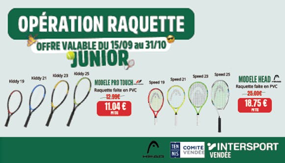 Et la première action concrète résultant de ce partenariat est déjà mise en place ! Les jeunes licenciés vendéens peuvent bénéficier d'une remise sur l'achat d'une raquette. Pour en bénéficier, rapprochez vous de vos clubs, qui transmettront une commande groupée.