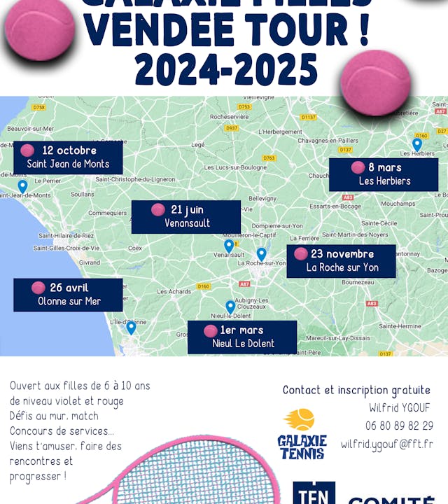 Organisées par le Comité de Vendée, les journées du Galaxie Filles Vendée Tour sont des occasions uniques pour les jeunes joueuses (niveaux galaxie violet et rouge) de poursuivre leur apprentissage en jouant des matchs sur des terrains adaptés à leur niveau et de s'amuser avec des animations proposées tout au long de l’après-midi (défis au mur, concours de services..).